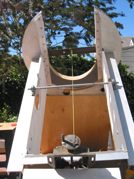 3.  Set the tube in place in the mount using the temporary aluminum dec axle with the offset arm inside the optical tube.  Repull the string through the hole in the dec axle in order to align the hole with the ra axis. Mark the axle at both dec bearings with a knife blade.  Remove the string and rotate the hole 90 degrees so that the laser beam can pass through.