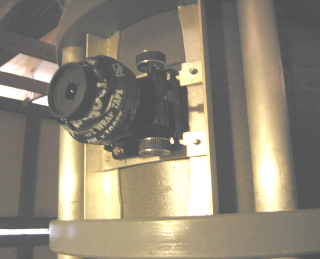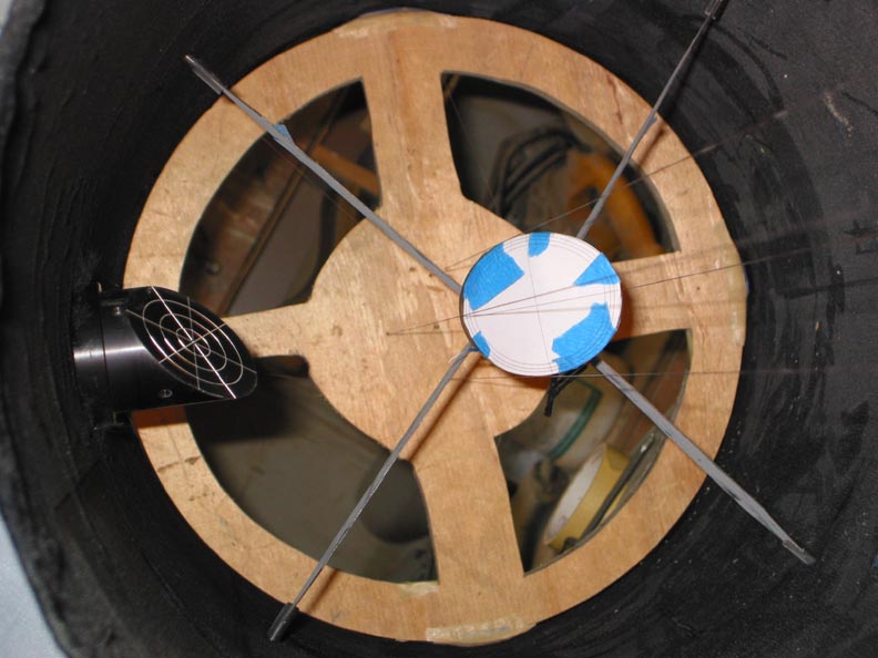 7. Using the laser pointer into adjust the focuser to aim at the major axis of the secondary. Then slide the mirror up or down so that the laser points to the center of the mirror. Remove the paper template and adjust the diagonal to aim at the center of the bottom plywood disk (not the offset center.) Remove the plywood disk and use the laser to position the primary mirror in the center.
