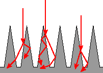 I also had the idea that I could punch an aluminum sheet with a matrix of small closely spaced holes, flip the sheet over and punch back the other way between the holes. This leaves a saddle surface with (almost) all angles of reflection leading into the holes. Also, the sheet will wind up being spaced away from the telescope's tube - plastic laminate in my case - giving a chimney for thermal currents to be exhausted. I did a small sample and was disappointed in the reflectivity. The ridge of the saddle are too broad. It would need to be a crisp line to be effective. I do still like the idea of a chimney, but don't see a way to make it work.