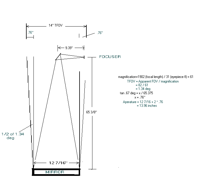 So looking at the trig in the figure above, we could make the tube 14" (at the focuser) and have no vignetting of the TFOV. But this is not wide enough. There can be convection currents hugging the wall of the tube and we must make it larger to keep the offending currents away from the light which will be forming the image. So the tube diameter becomes 15". Fine, but by enlarging the tube to accommodate currents, the focuser is pushed 1/2" farther away from the diagonal than is absolutely necessary. This is going to take care of itself when we consider the focuser drawtube length.