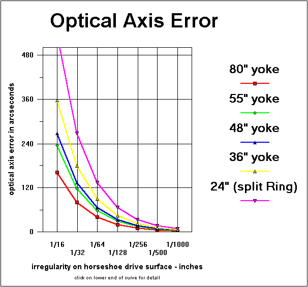 Any bumps or depressions on the horseshoe bearing surface will result in movement of the optical axis: This error is solely a function of the size of the irregularity and the distance to the south bearing of the yoke. The shorter the distance from the horseshoe bearing to the south bearing the larger the angular error. The formula is: